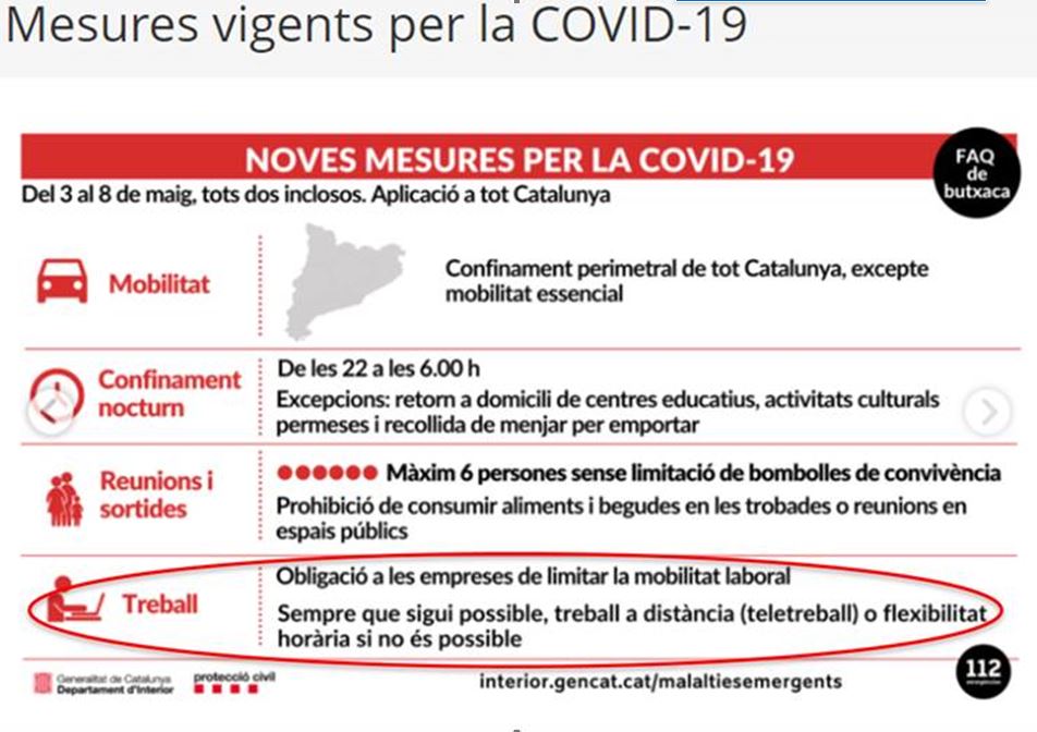 Tampoc la obligatorietat de reduir la mobilitat laboral i recomanació de Teleteball publicat pel PROCICAT no ha estat respectada per l’empresa tal com es descriu en aquest enllaç : https://interior.gencat.cat/ca/arees_dactuacio/proteccio_civil/consells_autoproteccio_emergencia/malalties-transmissibles-emergents-amb-potencial-alt-risc-/noves-mesures-per-contenir-els-brots-covid-19/