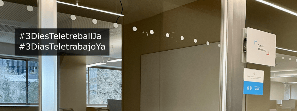 Tal com us vam informar fa un parell de setmanes al bloc, portem des del mes d’abril de 2021 sense parar de treballar per aconseguir que l’Empresa implementi l’últim punt de l’Acord Laboral que vàrem signar al juliol del 2020 amb el suport del 86% de la plantilla: els 3 DIES DE TELETREBALL.